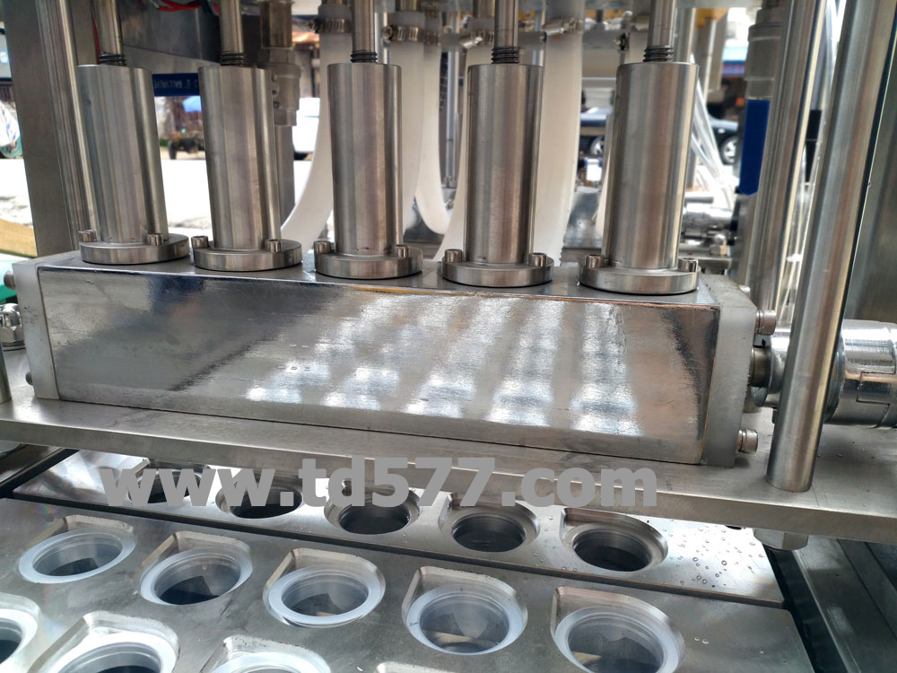 全自動(dòng)操作,自動(dòng)完成落杯、灌裝、紫外線殺菌、光電跟蹤、日期打印、封口、切邊等。